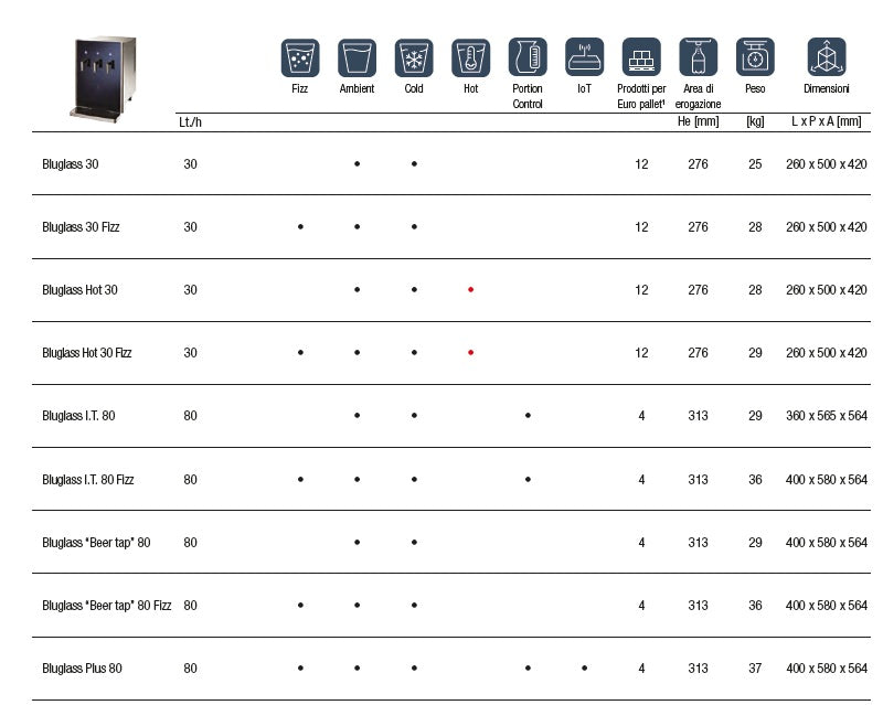 Bluglass I.T è il modello ideale per chi cerca un'opzione compatta, potente ed eleganteper garantire un importante e costante approvvigionamento di acqua di qualità sia nella ristorazione che in ufficio. Con le sue caratteristiche avanzate, questo sistema offre prestazioni eccellenti pur occupando poco spazio. Inoltre, il design elegante del Bluglass I.T. si adatta perfettamente a qualsiasi ambiente, aggiungendo un tocco di stile e raffinatezza. Sia per un locale moderno che per un ufficio professionale, Bluglass I.T. rappresenta la scelta ideale per soddisfare le più disparate esigenze. È dotato di comandi con i pulsanti in acciaio inox di elevata qualità.
