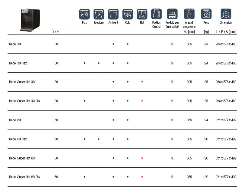 Un rapporto davvero mai visto fra potenza, funzionalità, prestazioni e dimensioni. L’eleganza del nero fuori, tutta la potenza di scelte tecnologiche di livello “pro” al suo interno, dove trovano spazio anche gli alloggiamenti per un filtro e una bombola CO2 monouso. Rebel è una sorgente piena di energia per erogare un bicchiere o una bottiglia di acqua gassata fredda, liscia e anche acqua calda alla temperatura perfetta per un tè o una tisana.